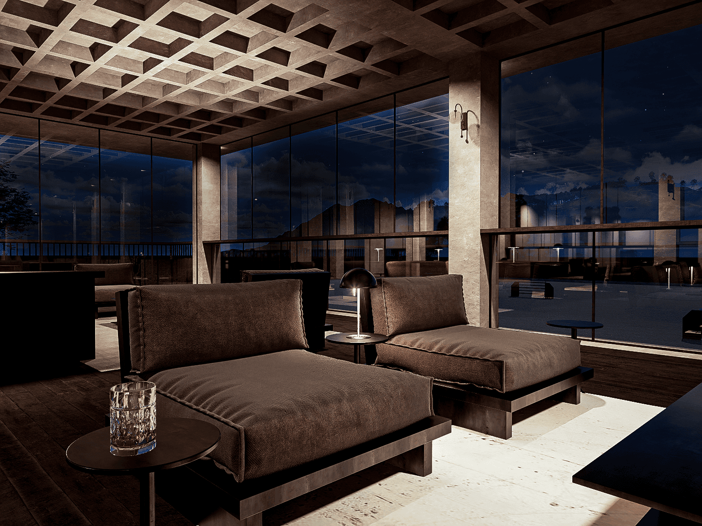 Concrete, wood, and glass come together to create a warm, timeless atmosphere, framing views and guiding each movement. The interior is conceived as an extension of its surroundings, where the natural and the built coexist in harmony.