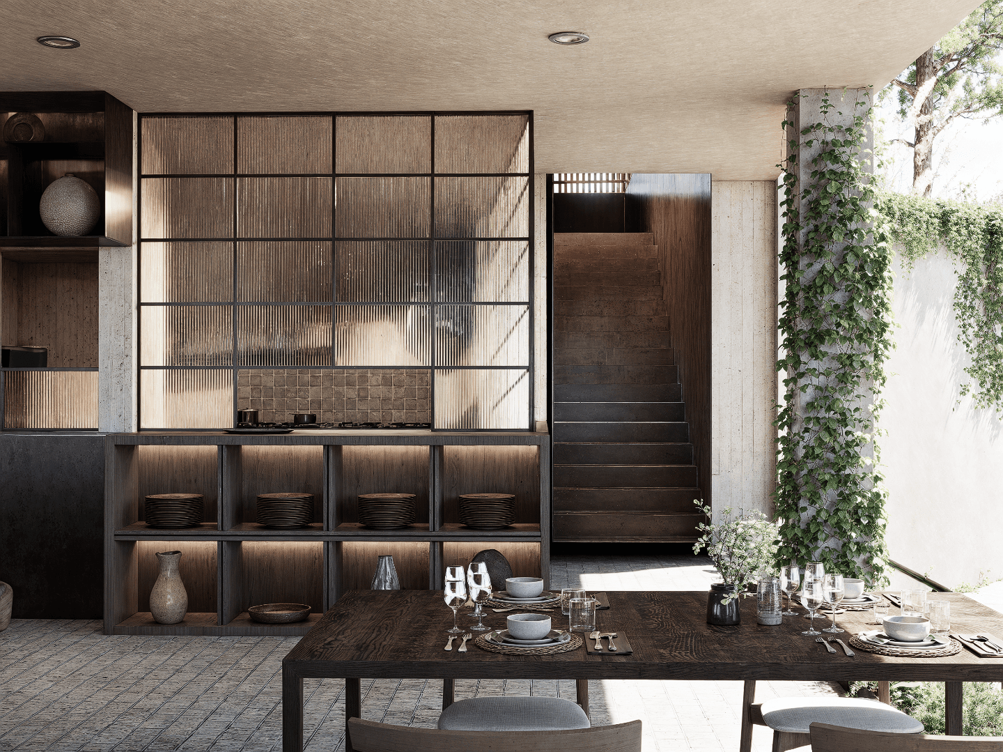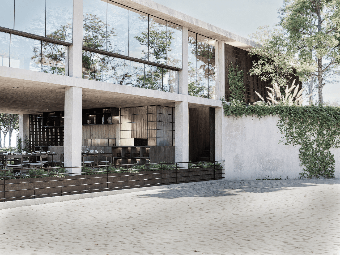The project is defined by a restrained structure, honest materials, and a constant dialogue between light, vegetation, and matter.
